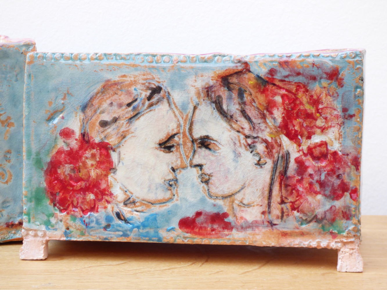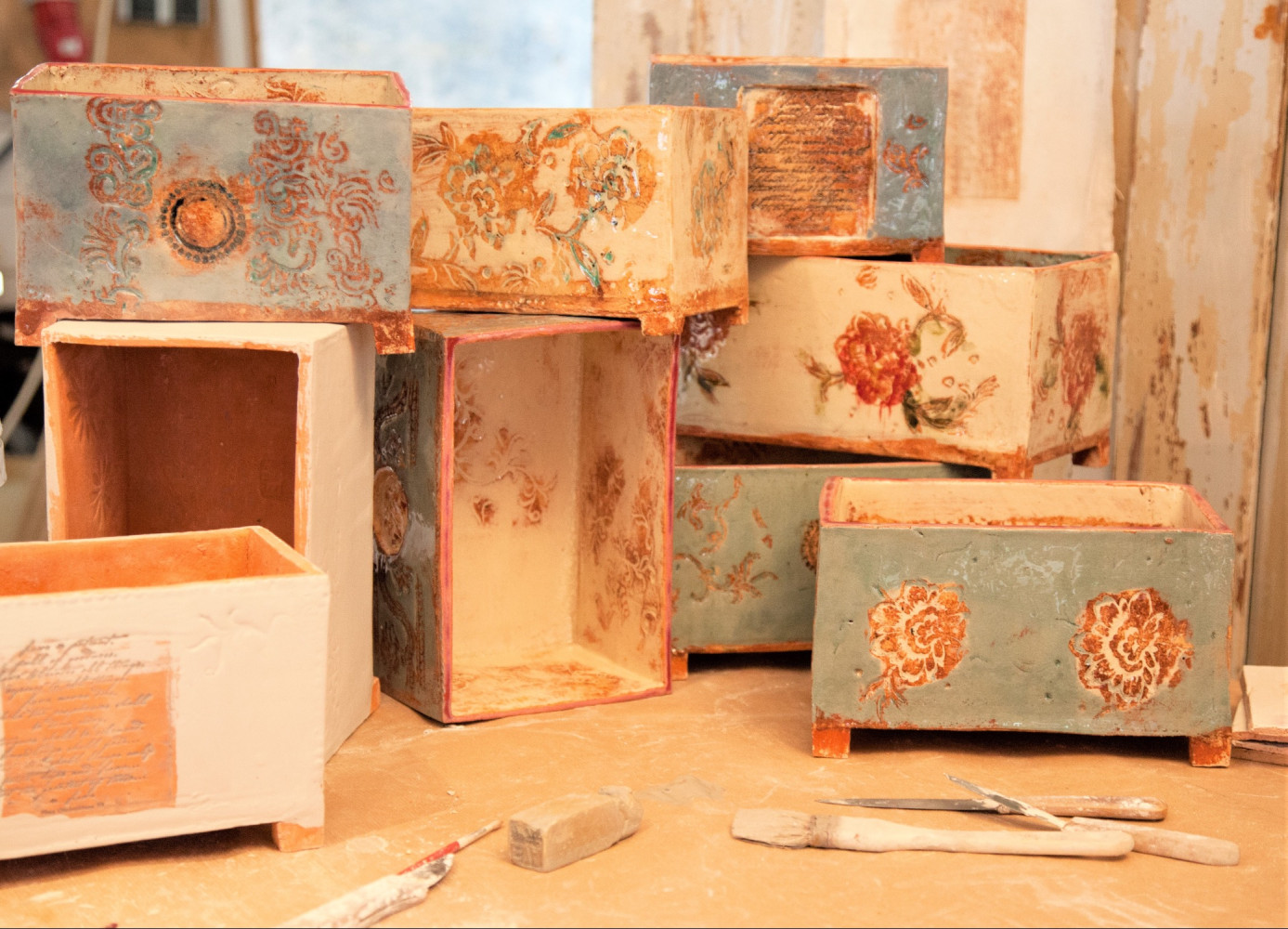 Die Verzierungen variieren, je nach Jahreszeit, Stimmung in mir, Impulsen von Außen und Innen. Alle Kästchen sind Einzelstücke. Alle werden aus Terracotta-Steinzeugton gefertigt und bei 1045 Grad C und 1080 Grad C gebrannt.