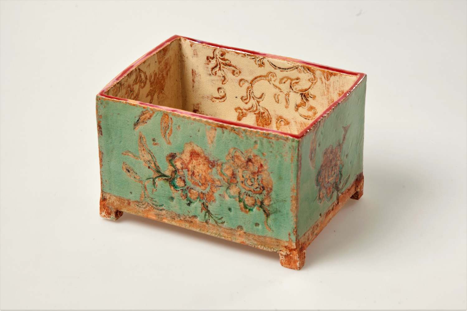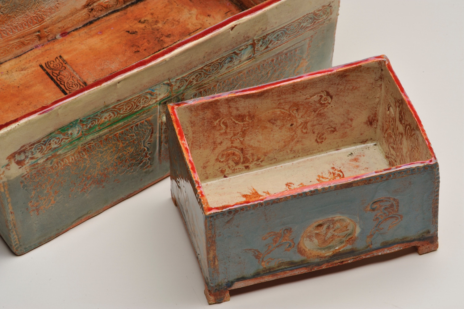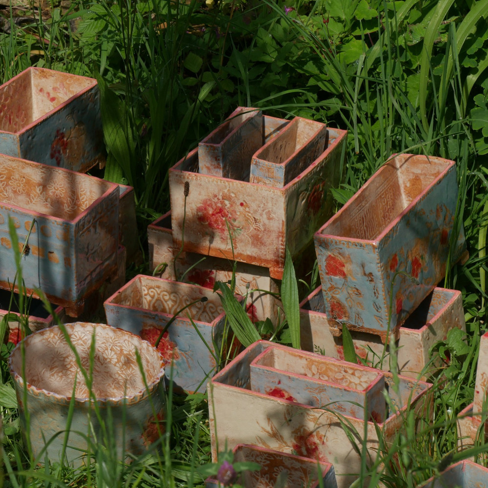 Die Verzierungen variieren, je nach Jahreszeit, Stimmung in mir, Impulsen von Außen und Innen. Alle Kästchen sind Einzelstücke. Alle werden aus Terracotta-Steinzeugton gefertigt und bei 1045 Grad C und 1080 Grad C gebrannt.